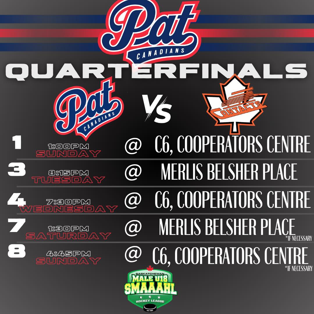 The chase for another SMAAAHL Championship begins this Sunday as the 1st‑place Regina Pat Canadians open their quarterfinal series against the 8th‑place Saskatoon Contacts. Puck drop is set for 1:00 PM at the Co-operators Centre, and the building is ready to come alive with playoff intensity.
